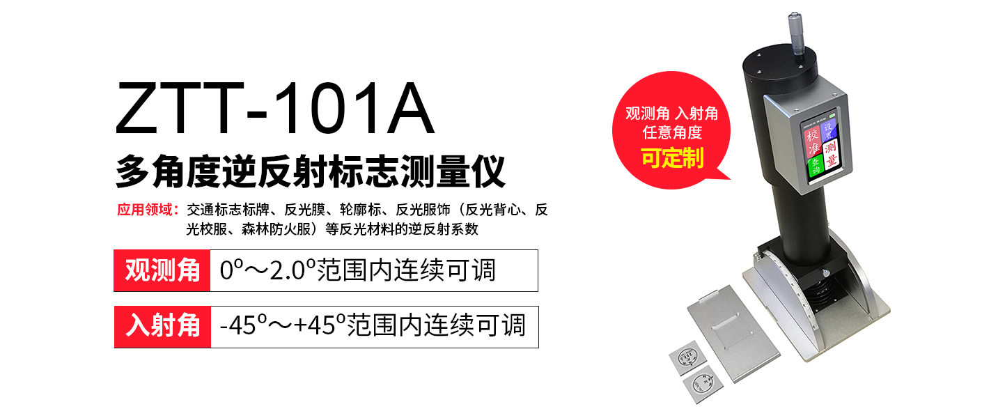 ZTT-101A多角度逆反射標志測量儀是用來測量交通標識材料逆反射系數(R′)的專用儀器。適用于材料生產單位、質量監督部門、工程施工和監理單位等對逆反射標識材料的質量控制和檢測。該儀器的設計符合國際標準ISO 3864(1984)和國際照明委員會(CIE)NO.54技術規范的規定,并參照其它國家有關標準:如美國ASTM E808-01《逆反射描述標準》、ASTM E809-00《逆反射器光學性能的測量》、ASTM E810-00《反光膜逆反射系數測試方法》;德國DIN 67520-1994等。儀器性能符合我國交通行業標準JT/T612-2004《逆反射測量儀》的規定,滿足我國 國家標準GB/T18833-2012《公路交通標志反光膜》規定的測量要求。