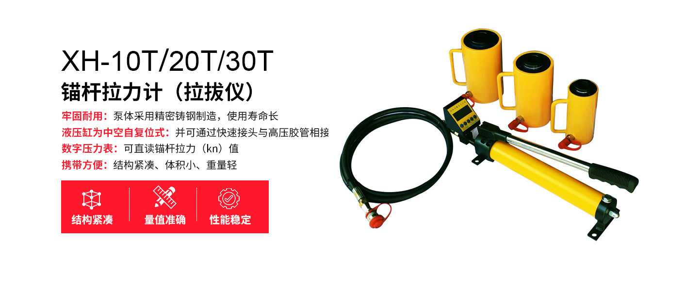 由北京天地星火科技發展有限公司研制生產的XH-10T/20T/30T型錨桿拉力計(拉拔儀)適用于錨桿、錨索、鋼筋、錨栓等錨固體錨固力的檢測,是錨桿施工支護工程質量檢驗常用儀器之一。