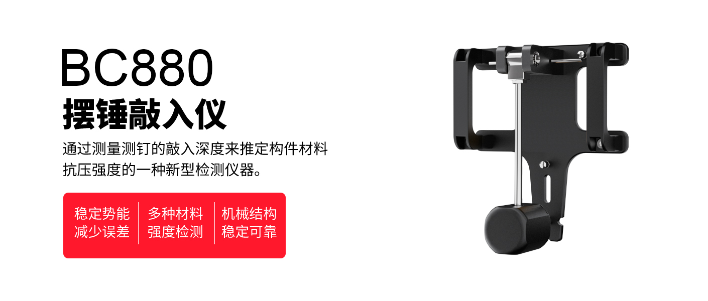BC880 擺錘敲入儀是以固定力值將測釘敲入待測構件,通過測量測釘的敲入深度來推定構件材料抗壓強度的 一種新型檢測儀器。適用于燒結普通磚砌體工程中磚與砌筑砂漿抗壓強度的現場檢測、砌體工程中蒸壓加氣混凝土砌塊與砌筑砂漿抗壓強度的現場檢測、普通混凝土的抗壓強度現場檢測和工程結構中木材弦向靜曲強度的現場無損檢測。