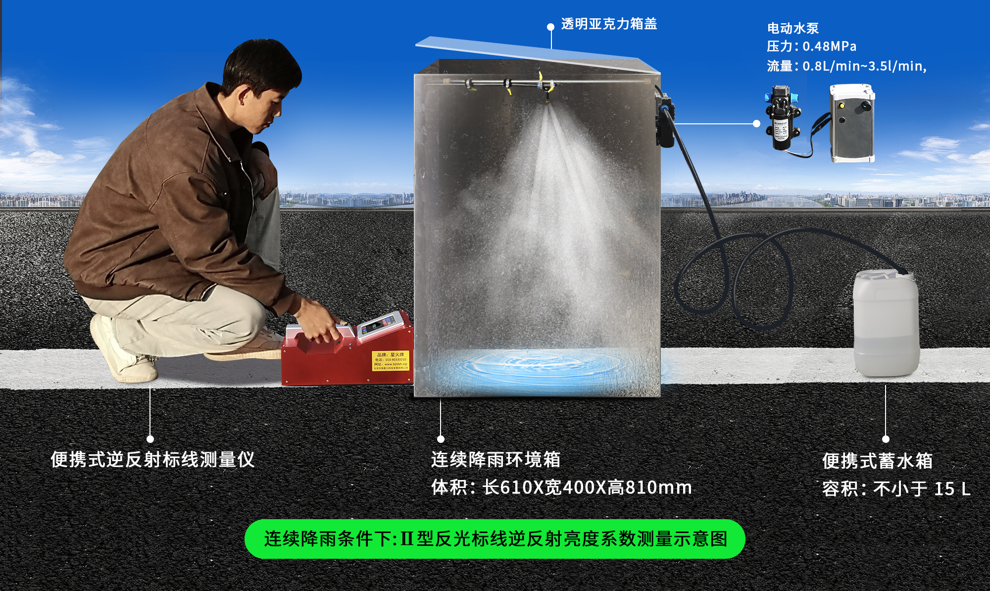 XH-YL型人工連續(xù)降雨模擬噴淋裝置,由連續(xù)降雨環(huán)境箱,電動水泵和便攜式蓄水箱組成。是檢測雨夜環(huán)境下反光標(biāo)線逆反射系數(shù)的重要裝置,與雨夜標(biāo)線逆反射測量儀配合使用。