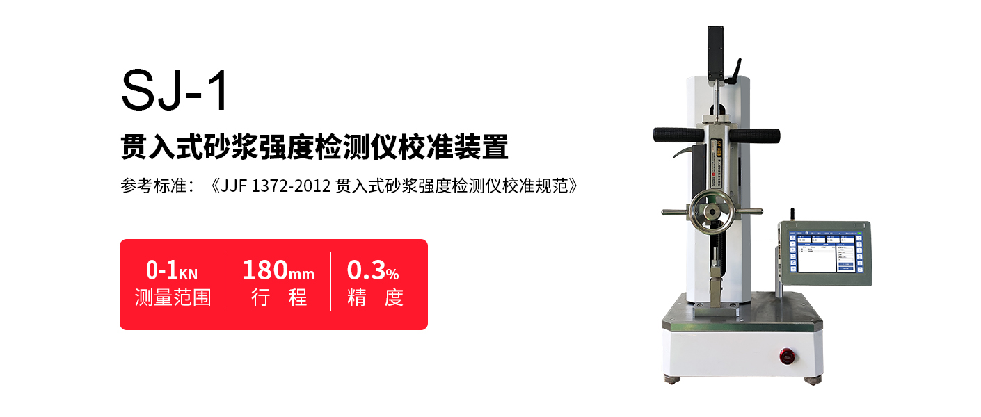 SJ-1 系列貫入式砂漿強度檢測儀校準裝置由高精度位移傳感器、高 精度測力傳感器、測量儀表及螺旋加載機構組成,通過手動/自動加載, 同時測量位移和力值,實現對貫入式砂漿強度檢測儀的檢測校準。。 具有檢測簡單、攜帶方便、精度高等優點。